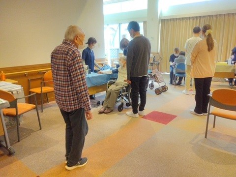 初日は雪が降りどうなることかと心配されました。寒いなか、先生、看護師さん、検査技師さんたくさんの方々にお越しいただきました。2日間に渡り、ご入居者さま、スタッフの健康診断を行っていただきました。これまでは近隣の病院で行っていましたが今年からホームで行うことになりました。「こんなの初めてね」「すごい人ね」待ち時間にお話ししたり、ちょっとしたイベントのようでした。