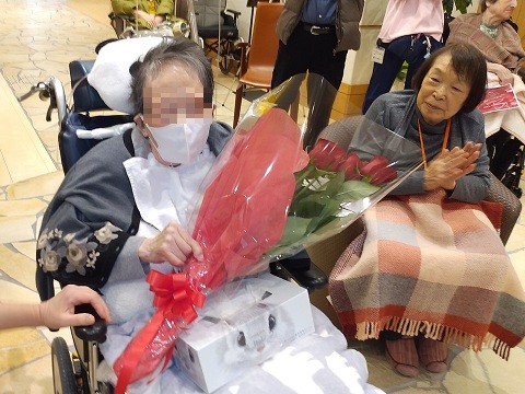 「ハッピバースデーディア○○さん~」と皆さまの合唱とともにバラの花束をお渡しすると、満面の笑みで喜ばれていました。