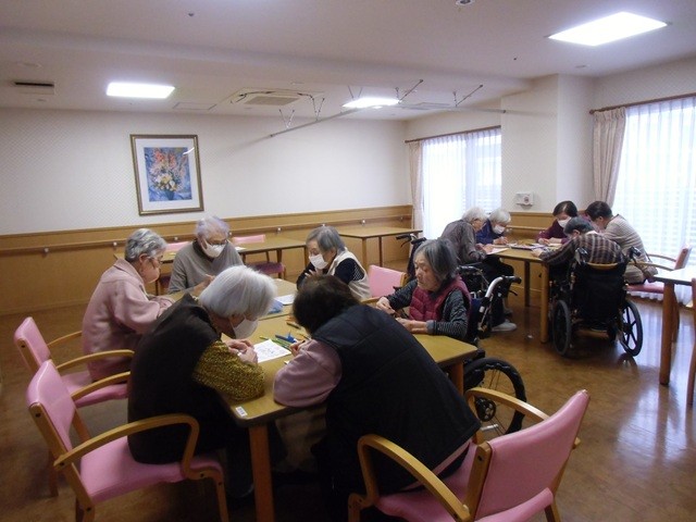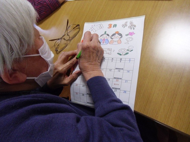 2月25日、ナービス藤井寺恵美坂では 毎月恒例の『塗り絵カレンダー』を実施いたしました。色とりどりのお内裏様、お雛様です。