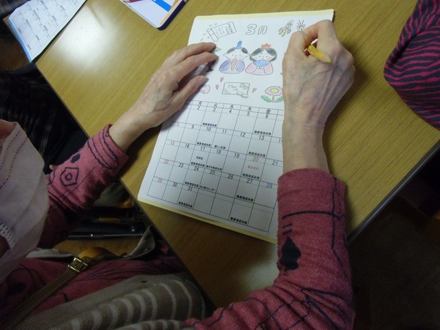 3月のカレンダー、いろんな色の可愛いお内裏様、お雛様が完成しました。「このカレンダー、毎月楽しみにしているのよ!」と言っていただいています。