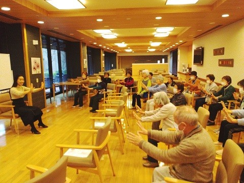 今回の音楽療法では♪大きな古時計♪うれしいひなまつり♪花は咲くを皆さまと一緒に歌いながら、体操・腹式呼吸・発声練習を行いました。大きな声で歌い、体を動かすことで自然と笑顔があふれる時間となりました。