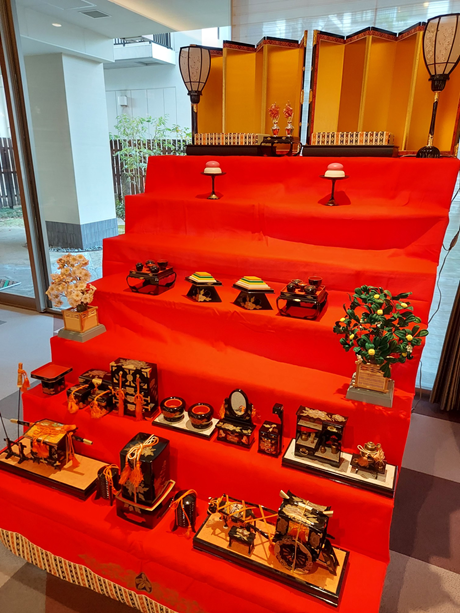 館内に飾られた七段飾りのひな人形はとても華やかで、ご入居者さまや来館された方々の目を楽しませてくれています。