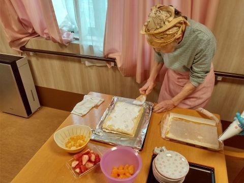 ご利用者さまと一緒にケーキ作りを行いました!とても手際良く生クリームを塗り、フルーツをトッピングしてくださいました。