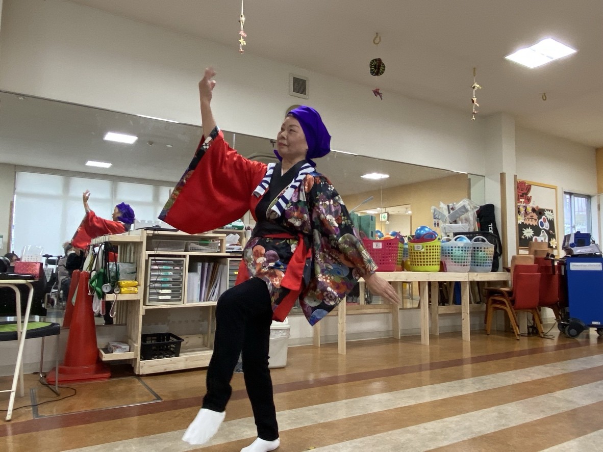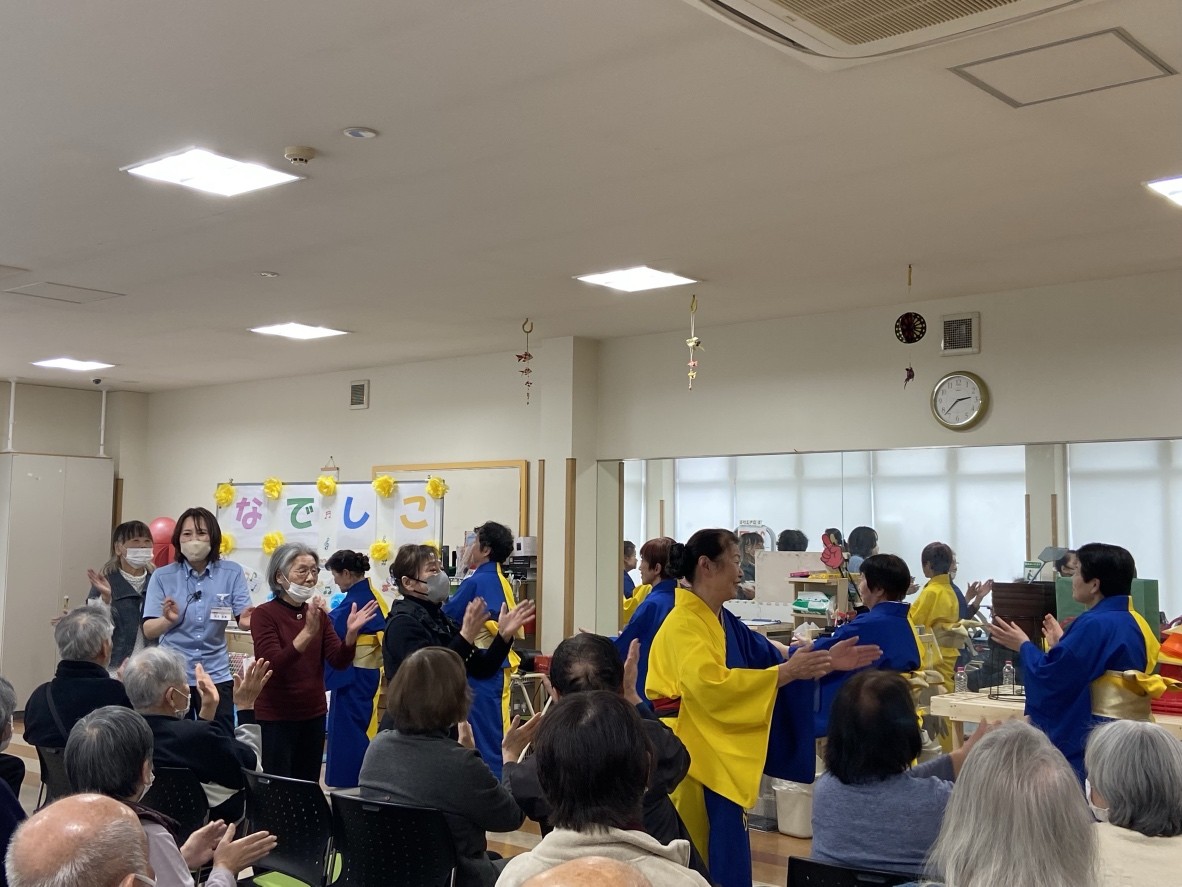 本日は、ボランティアグループ『なでしこ』さんにお越しいただき、踊りイベントを開催しました!あいにくの雨となりましたが、なでしこさんの着物は黄色と青色のとても華やかな色合いで、見ているだけでも楽しむことができました。踊りが始まるまでの時間には、スタッフによるじゃんけん大会を開催!会場は笑い声に包まれ、大いに盛り上がりました♪踊りイベントでは、素敵で力強い様々な舞を披露していただきました。チーム同士で「良かったよ」と声を掛け合う場面もあり、とても印象的でした。最後は『炭坑節』を、スタッフやご利用者さまも一緒に参加して踊りました♪皆さまのとても良い笑顔が見られ、楽しいひとときとなりました。