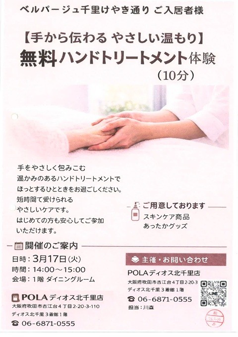 3月17日、ベルパージュ千里けやき通りでは『POLA北千里店さまによる無料ハンドトリートメント体験』を開催いたしました。