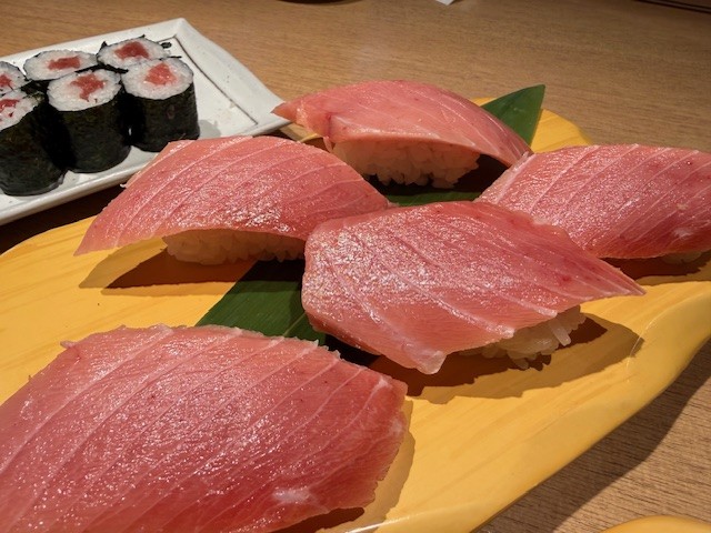 お好みのネタを伺って注文すると、流れてくるお寿司♪ 「わぁ、またお寿司が届いたわ♪こんなふうに運ばれてくるなんて衝撃的ね!」とワクワクした高揚感が伝わりました!
