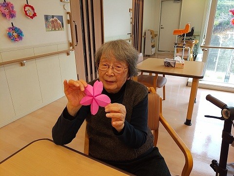 季節を感じながら、折り紙で桜のお花を作成しました。