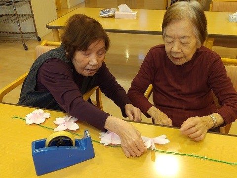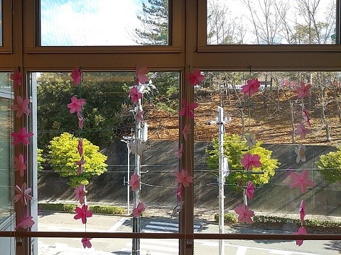 ユトリーム朝霧のダイニングにも桜を咲かせようと、みんなで力を合わせて作りました。