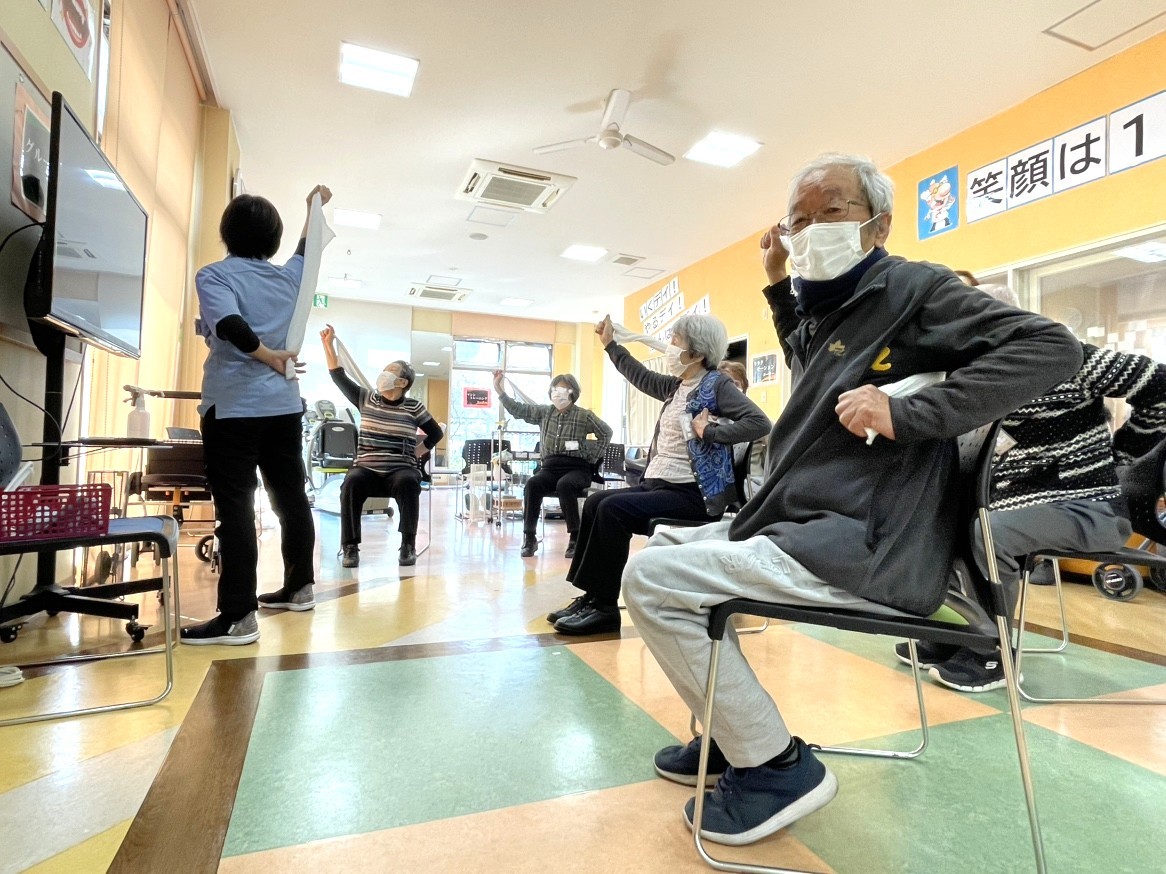 今回ご紹介するのは『グループ体操』です。グループ体操は、食事・排泄・更衣・入浴といった日常生活に欠かせない動作をもとに構成された体操で、実生活に直結した身体機能の維持・向上を目的としています。