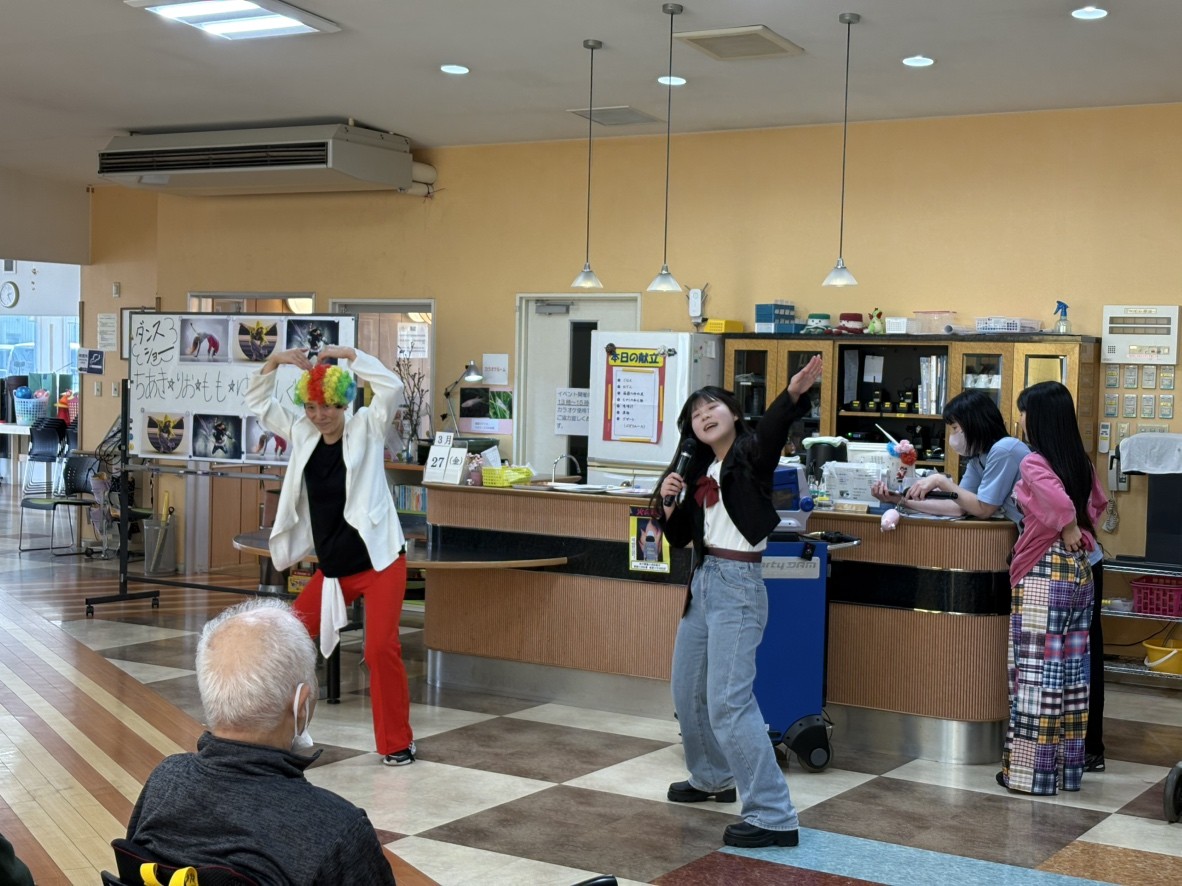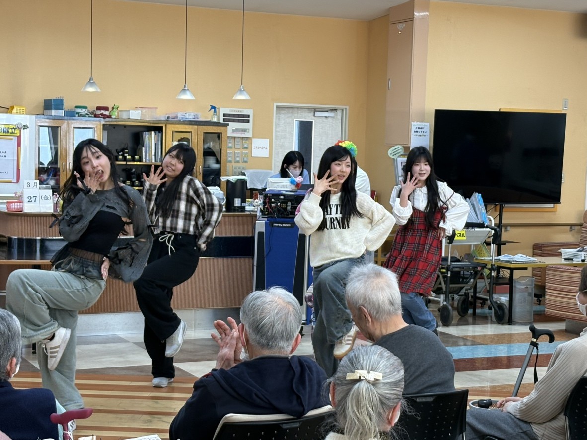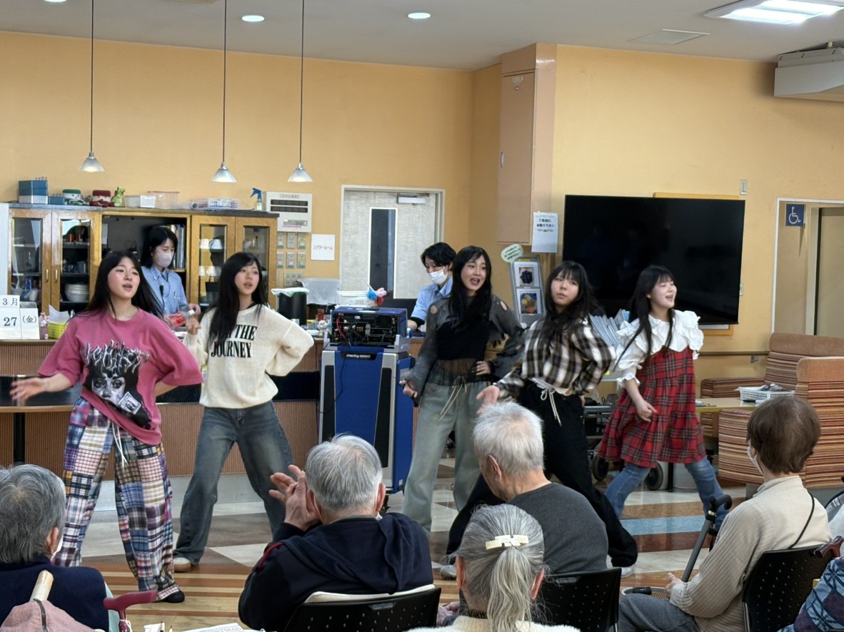 本日は、スタッフの娘さまやお孫さま、そしてそのご友人の皆さま(計5名)が来てくださり、ダンスを披露してくださいました。披露してくれたのは、J-POPやK-POPなど、今人気の楽曲に合わせた元気いっぱいのダンス。息の合った動きと笑顔あふれるパフォーマンスに、ご利用者の皆さまも自然と手拍子をされ、会場はとても明るく楽しい雰囲気に包まれました。「若いっていいね★」「元気をもらったよ!!」といった声も多く聞かれ、皆さまとても喜ばれているご様子でした。ダンスの後には、ご利用者お一人おひとりと丁寧に握手をしてくださり、直接ふれあう温かい時間もありました。笑顔で手を取り合う姿がとても印象的で、心温まるひとときとなりました。来てくださった皆さま、本当にありがとうございました。またお会いできる日を楽しみにしています。