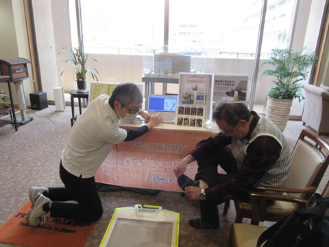 スポーツミツハシ様のご協力による、お悩み相談会を行いました。通常時の重心と特許取得のインソールを付けた時の重心の変化を体験していただきました。インソールを付けた時の安定に皆さまビックリ!