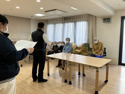 消防署への通報、館内放送の模擬訓練の他、ご入居者さまに館内、屋外の非常階段をご覧いただき、実際に屋外非常階段を降りていただきました。