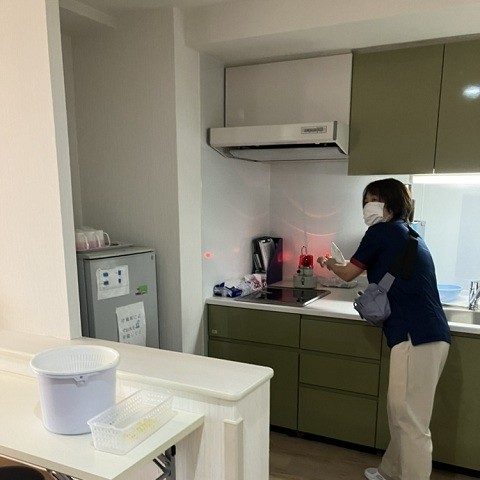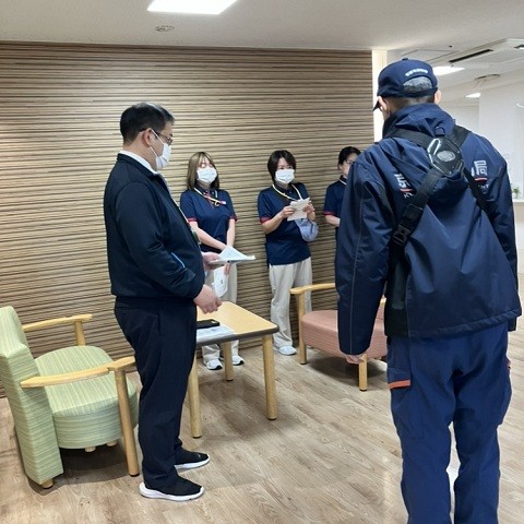 夕食後を想定した避難訓練です。遅出者2名・夜勤者2名でご入居者さまに安全に避難していただくために火災発生時の初期動作の確認を行いました。