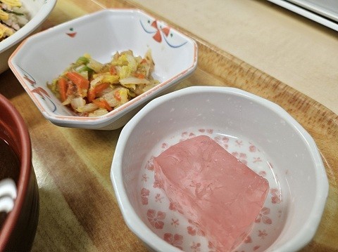 そんなナービス京都二条ひな祭りの夕食は『ちらし寿司』『白菜の和え物』『赤だし』『桜ゼリー』をご用意いたしました。