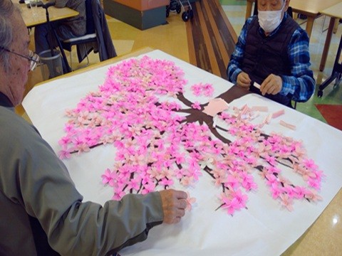 3月30日、デイサービスセンター ナービス堂山公園では4月のお花見に向けて『桜の壁面飾り』の制作に取り組みました!