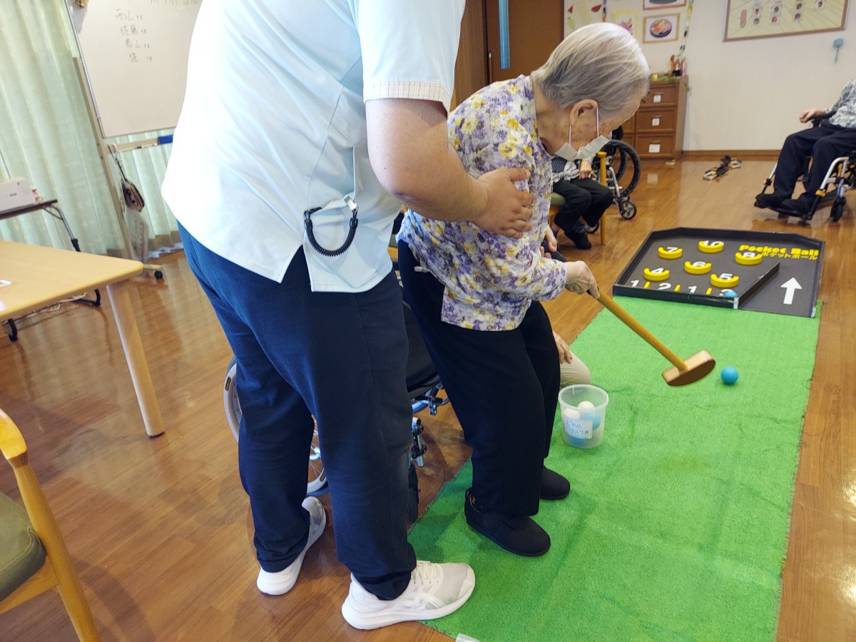 会場では、ご入居者の皆さまが思い思いにクラブを手に取り、狙いを定めながら真剣な表情でプレーされる姿や、成功した際に見せてくださる笑顔が印象的でした。周囲からは自然と拍手や応援の声もあがり、和やかで温かい雰囲気に包まれていました。