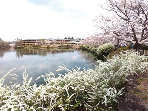 やわらかなピンク色が遊歩道沿いに広がり、ユキヤナギも白い小花を咲かせ、『春らしい風景』が広がっています。