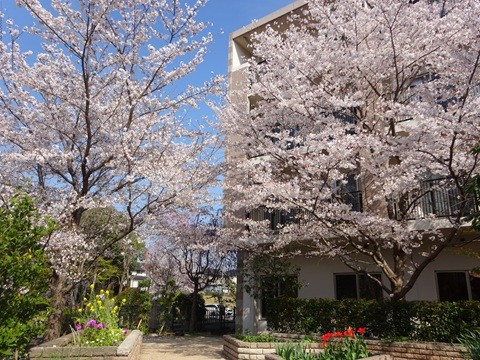 4月4日、ローズライフ高の原では、今ホーム内の『桜』が満開です。