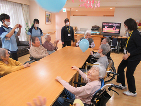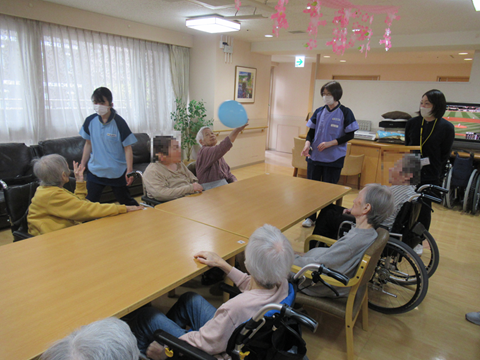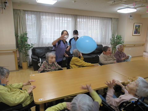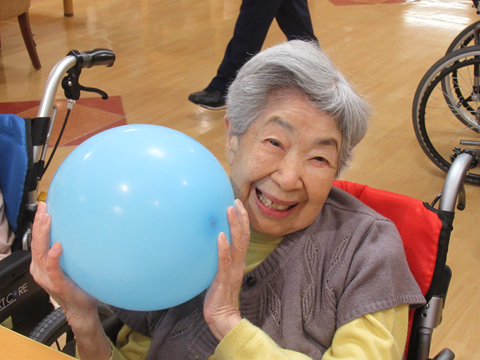 毎週日曜日にサークル活動をしています。今週は『風船バレー』です。最初は風船をひとつで行い、徐々に難しく風船を増やしました。「わぁ~♪来た来た!」「上がったよ~!」「ふたつも来たわ~!どうしよう!!」と弾ける笑顔でバレーをお楽しみいただきました。終了後、参加賞のお菓子をお配りすると「頑張ったご褒美やね♪ありがとう!」と喜んでいただけました。次回のイベントもお楽しみに!