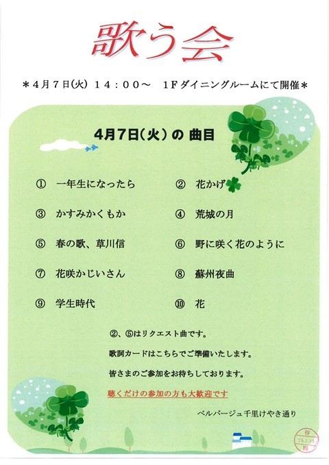施設ブログ トップページ 施設ブログ (千里)4月の『歌う会』♪ ベルパージュ千里けやき通り 2026.04.07 (千里)4月の『歌う会』♪ 4月7日、ベルパージュ千里けやき通りでは、『歌う会』を開催しました。 4月なので『春』や『花』を題材にした童謡をたくさん歌いました♪ご入居者さまのリクエストにも対応していただいております。 今回は15名の方が参加されました。来月の開催もお楽しみに♪ 【ベルパージュ千里けやき通り】 〒565-0874 吹田市古江台5-3-4 TEL 0120-619-318 FAX 06-7506-9016 ご入居相談お待ちしております♪ 一緒に働く仲間を募集中です♪ この記事で紹介されている施設の詳細はこちら 記事一覧に戻る
