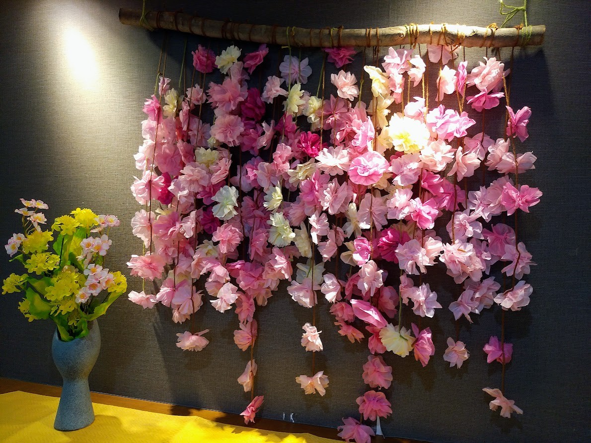 4月1日、桜が満開のユトリーム桜ケ丘より、フロアの『壁面飾りの桜』を作りました。外の桜にも負けないくらい、フロアも桜が満開です。