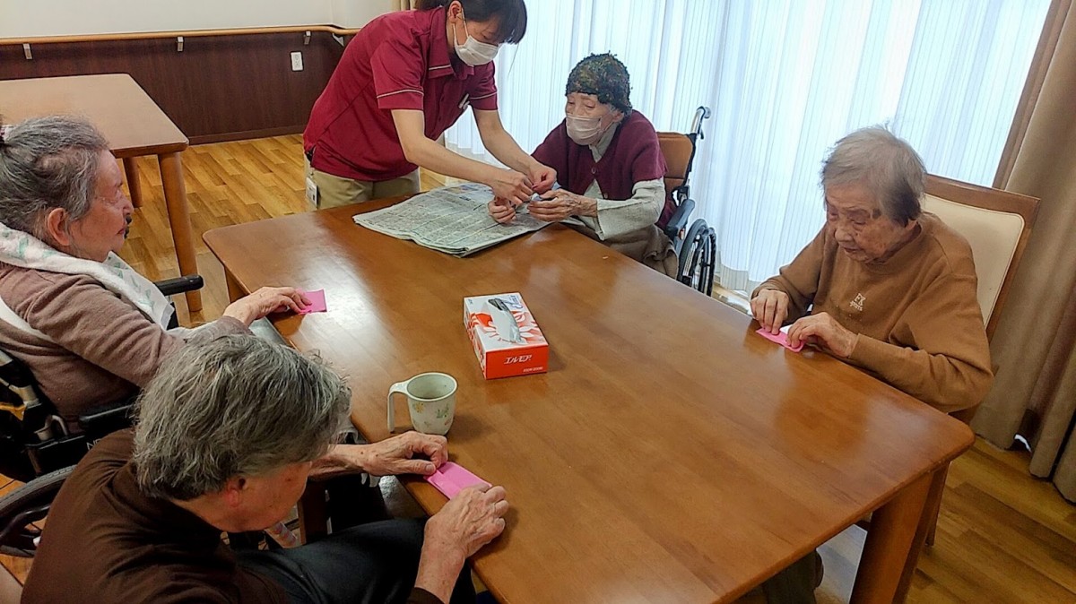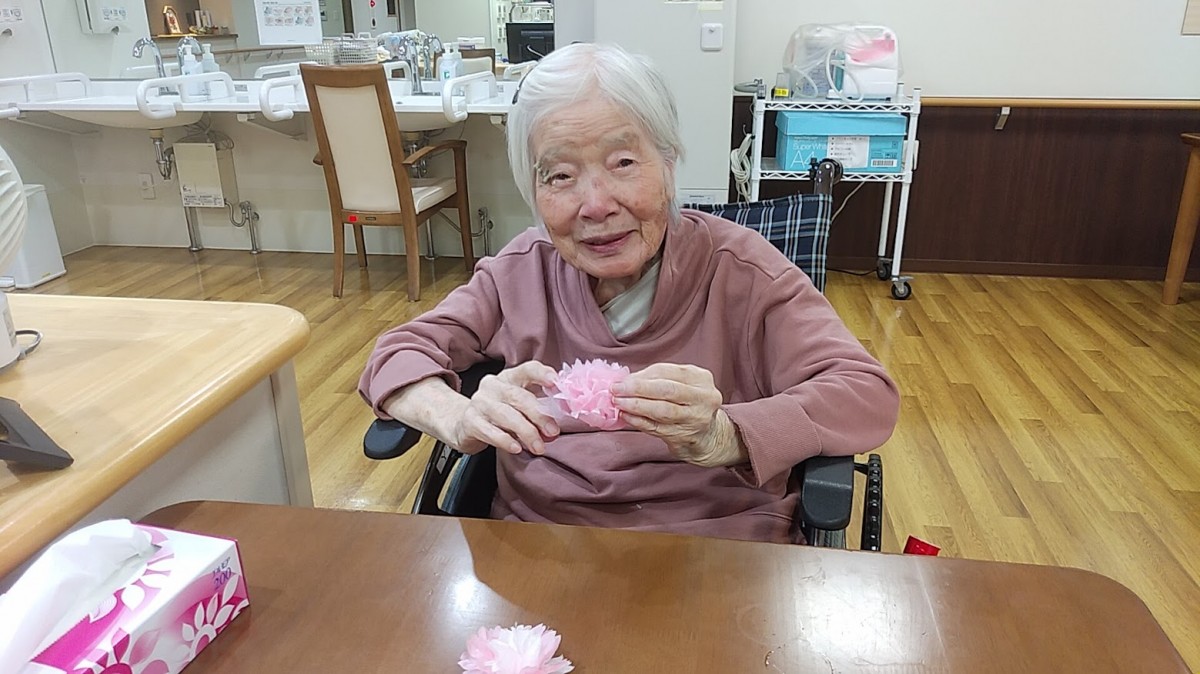 お花紙を折って、桜の花を作りました。みなさん、真剣な表情で取り組んでおられました。