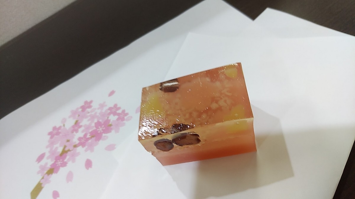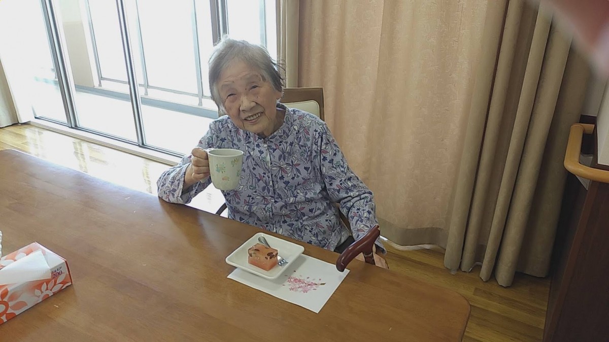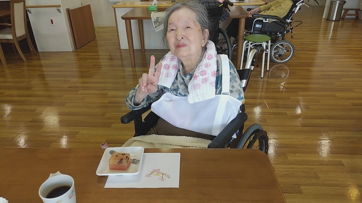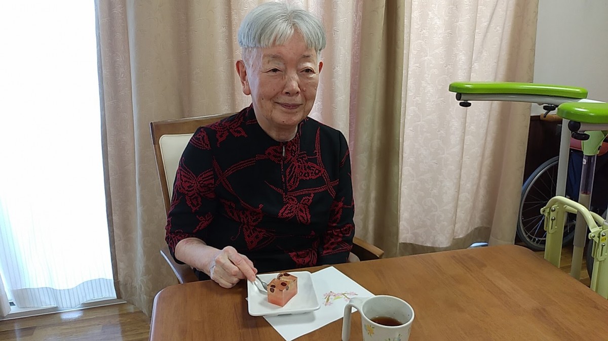 桜の花を作った後は、おやつに『桜のようかん』を召し上がっていただきました。「わぁ~、きれいね。食べるのがもったいないわ」「桜の季節はいいわね」と、、笑顔とおしゃべりの花が咲きました。
