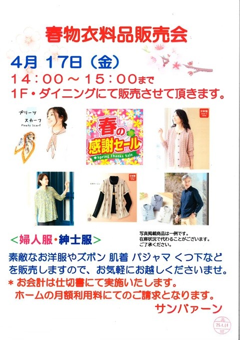 4月17日、ベルパージュ千里けやき通りでは、『サンバァーンさまの春物衣料品販売会』を開催しました。