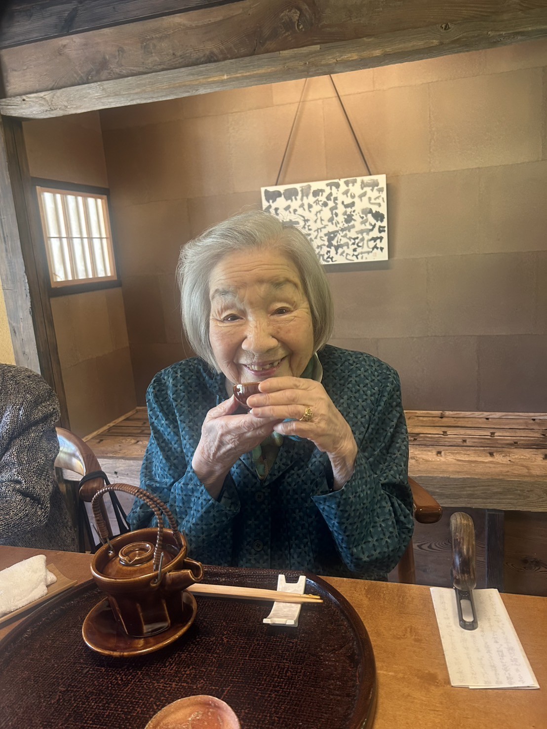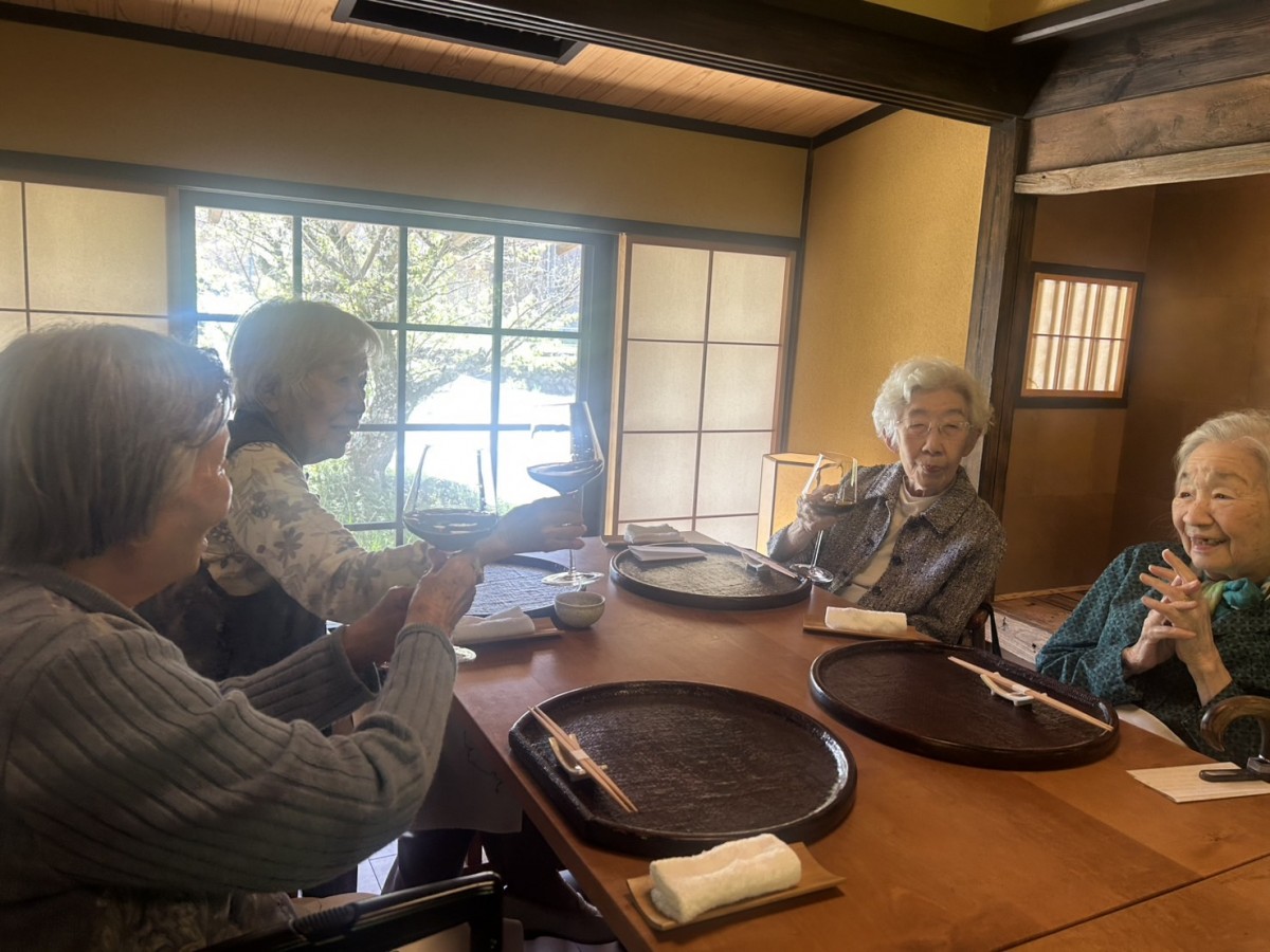 お料理は、体にしみわたるような優しい味わいでした。「おいしいね、この雰囲気がたまらなくいいわね」と皆さまが仰る通り、里山の一軒家の暖簾をくぐると、土間にはおかまが据えられ、子供のころにお過ごしになった風景に、懐かしさも感じられたようです。