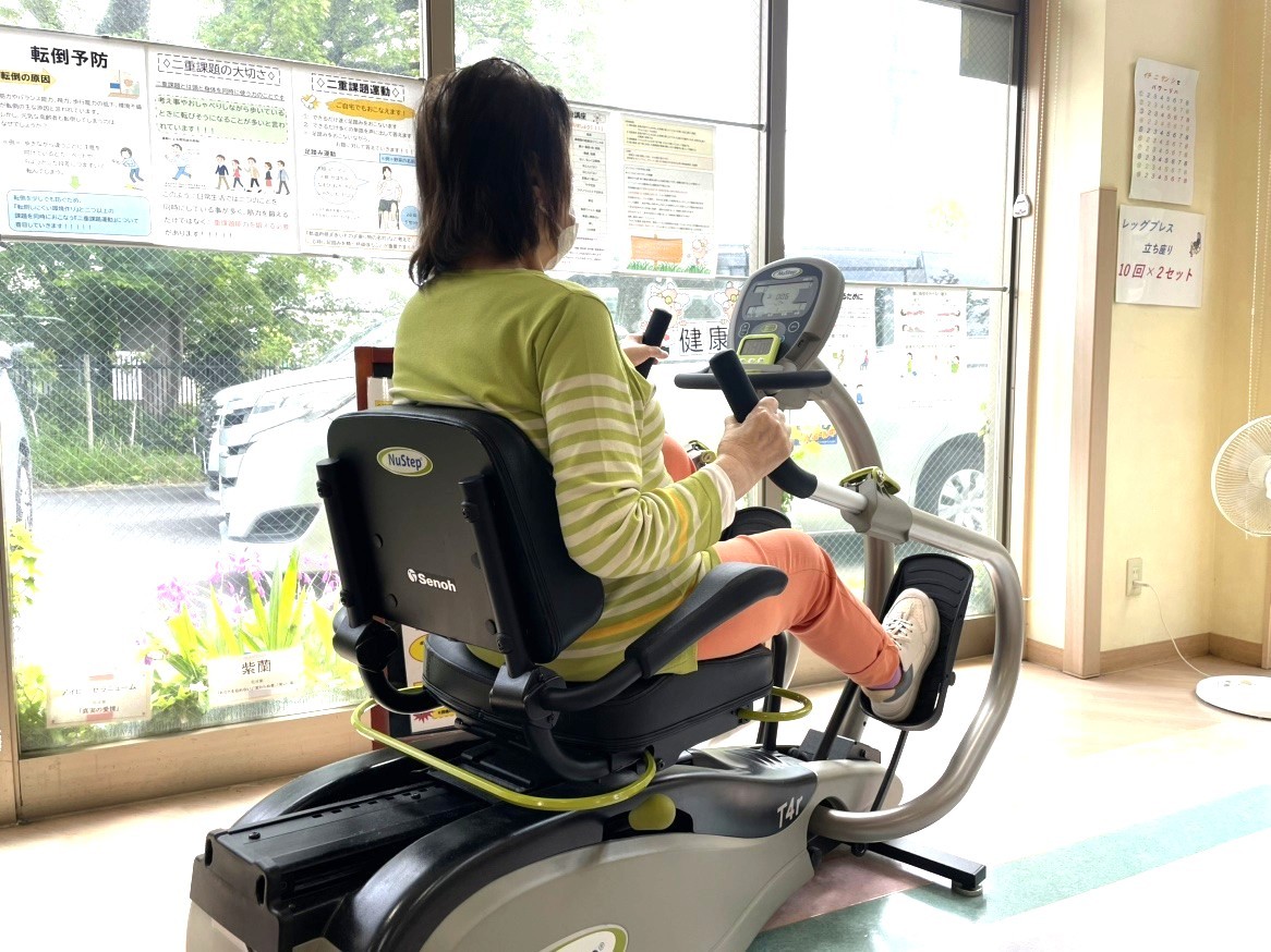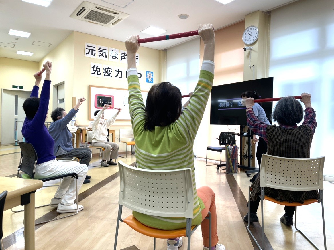 運動への意欲も素晴らしく、マシン運動の負荷は利用当初より大きく向上。自主トレーニングの棒体操では、背筋をしっかり伸ばし、棒の両端を持って自信に満ちた表情で掛け声とともに取り組まれています。その生き生きとした姿に、私たちスタッフも自然と笑顔になり、元気をいただいています。