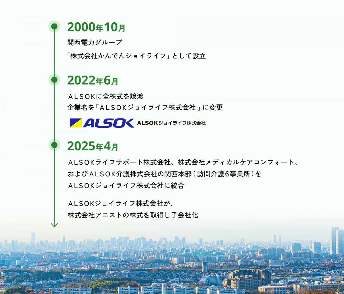 当社は、2000年の介護保険制度開始を契機に誕生し、地域のインフラを支える会社として、お客さまの暮らしや生活のお役に立てる事業を立ち上げてきました。そうした取り組みの中で、2022年6月、ALSOKグループの一員となり、ALSOKジョイライフ株式会社として、新たなスタートをきりました。