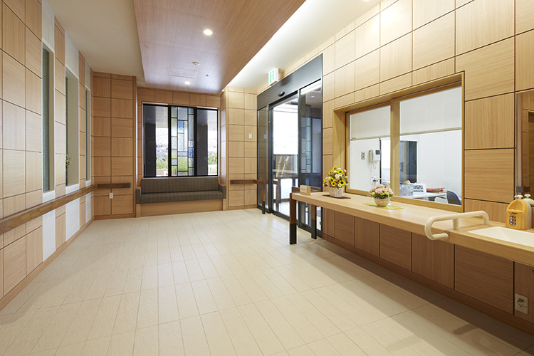 エントランス:天然木をあしらった、落ち着きある雰囲気のエントランスは24時間オートロックとなっています。フロントではスタッフがご家族さまやご入居者さまのさまざまなご相談に応じています。