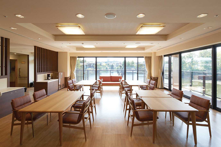 食堂兼機能訓練室:あやめ池に面した食堂は四季折々の風景を楽しめるスペースです。