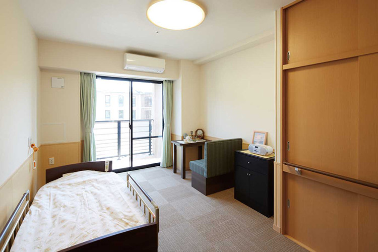 介護居室:介護居室は約23㎡の1ルームの48室をご用意しております。カーテン、照明、エアコン、介護用ベッド、寝具は標準装備です。