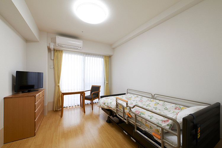 1人用介護居室:1人用介護居室は約18㎡の1ルームの66室をご用意しております。カーテン、照明、エアコンは標準装備です。