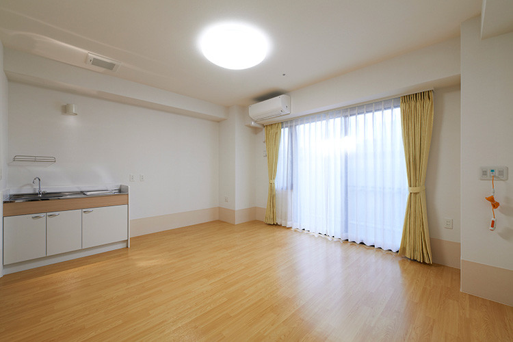 2人用介護居室:2人用介護居室は約27㎡の1ルームの4室をご用意しております。カーテン、照明、エアコンは標準装備です。