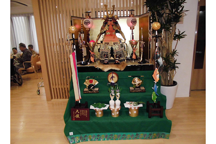 五月の節句:施設のエントランスにかぶとを飾りました。