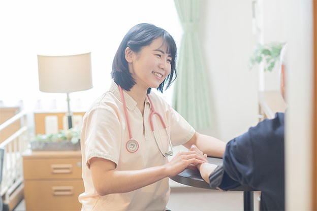 これは、介護保険における特定施設入居者生活介護の基準の2倍以上の人数(週40時間の常勤換算)です。看護スタッフも24時間365日体制でホーム内に常駐しており、ご入居者さまの健康状態の観察、医療処置、薬の管理、医師との連絡調整を担当しています。
