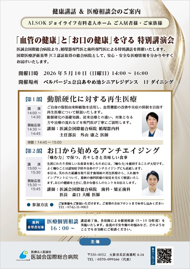 本セミナーは、医誠会国際総合病院の専門医をお招きし、「血管の健康」と「口元の健康」という、人生の質を大きく左右する重要なテーマについて、先進的かつ信頼性の高い医療知見をお届けするものです。